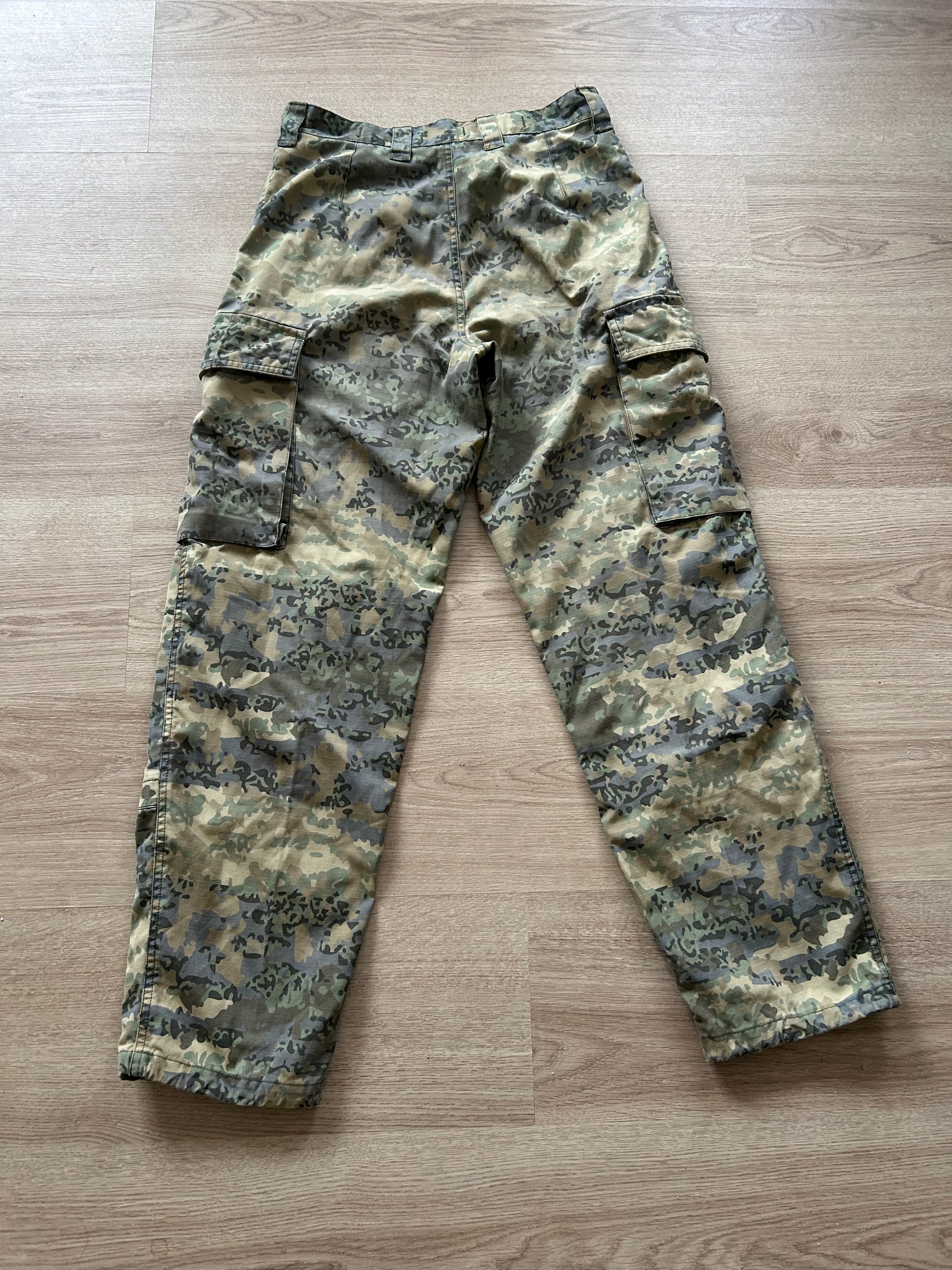 Waist: about 72 cm, inseam 72cm, outer leg 97cm. Has a few small damaged spots as shown in photos, and on ankles the straps to tighten the fabric are missing. Colors are slightly paler than on the other item above. Shown in photos 9-14.