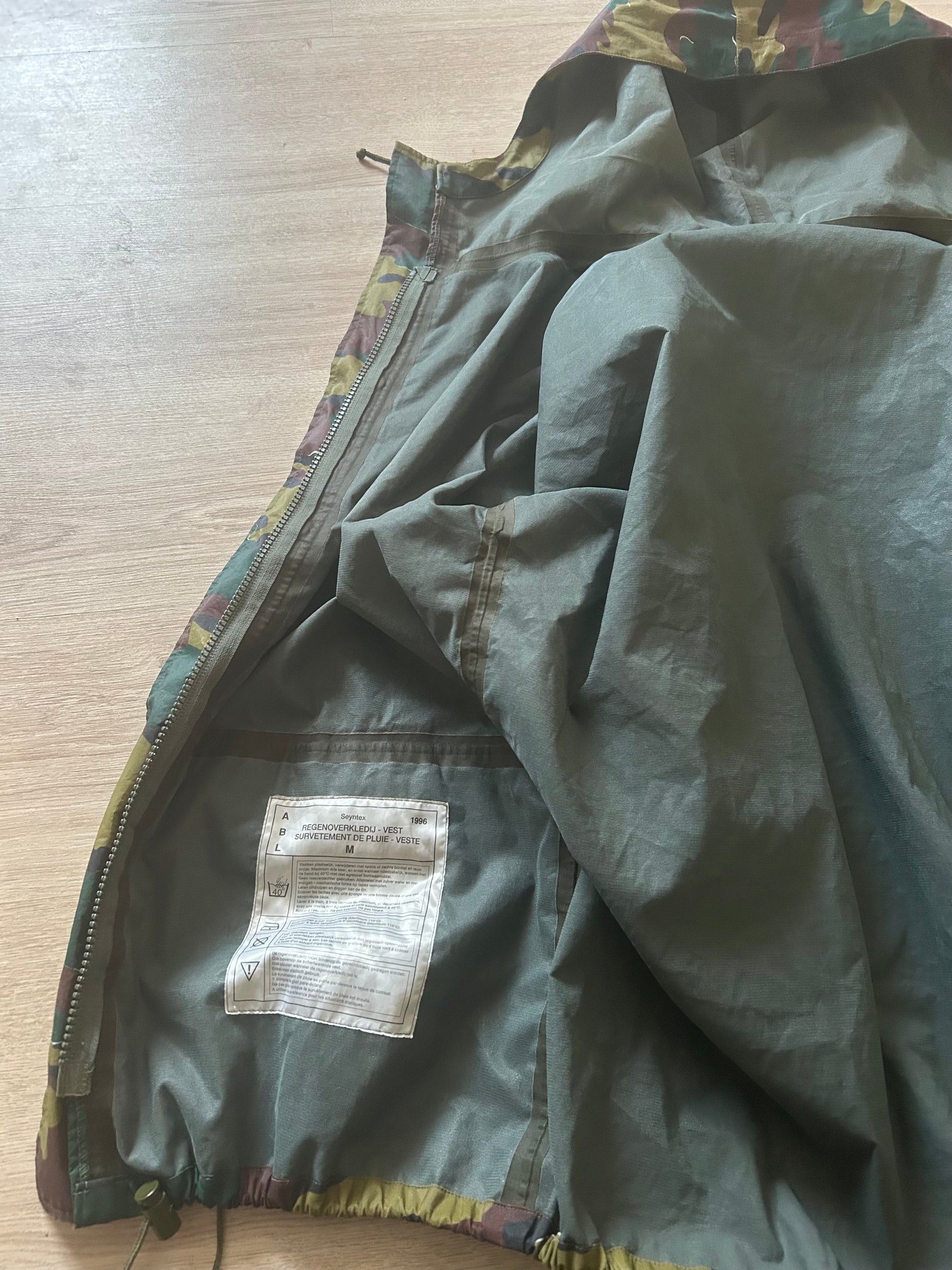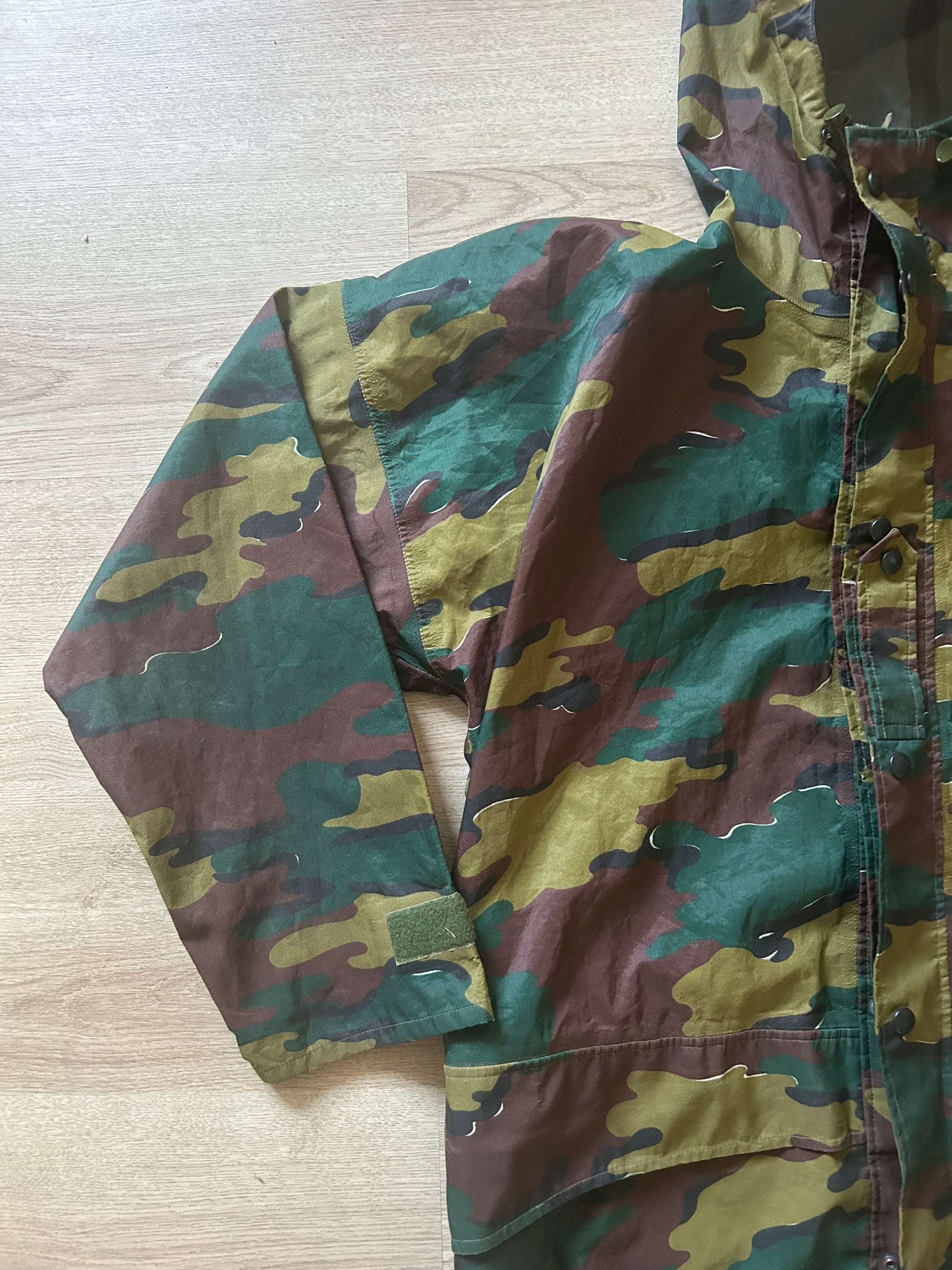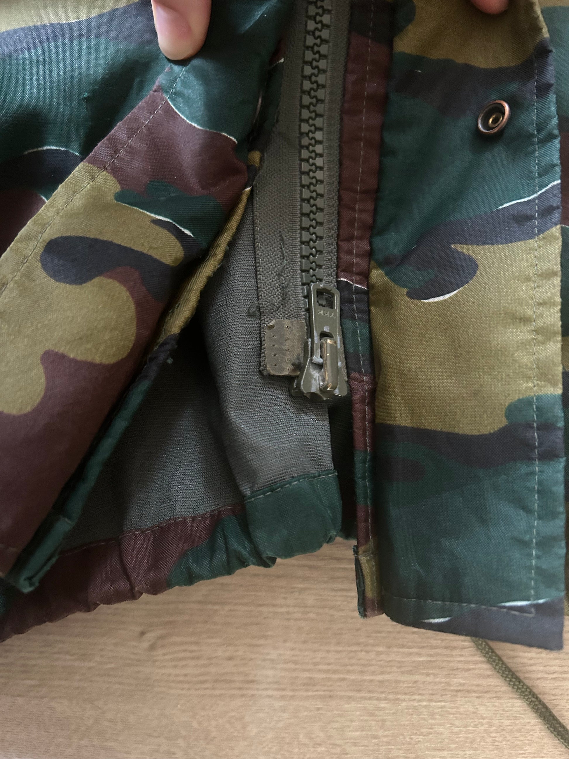 What's noticable immediately is that the pattern itself is a bit darker than on standard jigsaw uniforms. The fabric is still quite light and thin, so this isn't one of those heavy hardshells, I think it's intended more for light rain conditions. Production year is 1996, but the item is very well preserved and I didn't see any damage on membrane inside. Might have some storage marks or light stains on the outside. The main zipper got a bit detached at the bottom (see photo), but it just has to be sewn back on, it still works normally to zip or unzip.