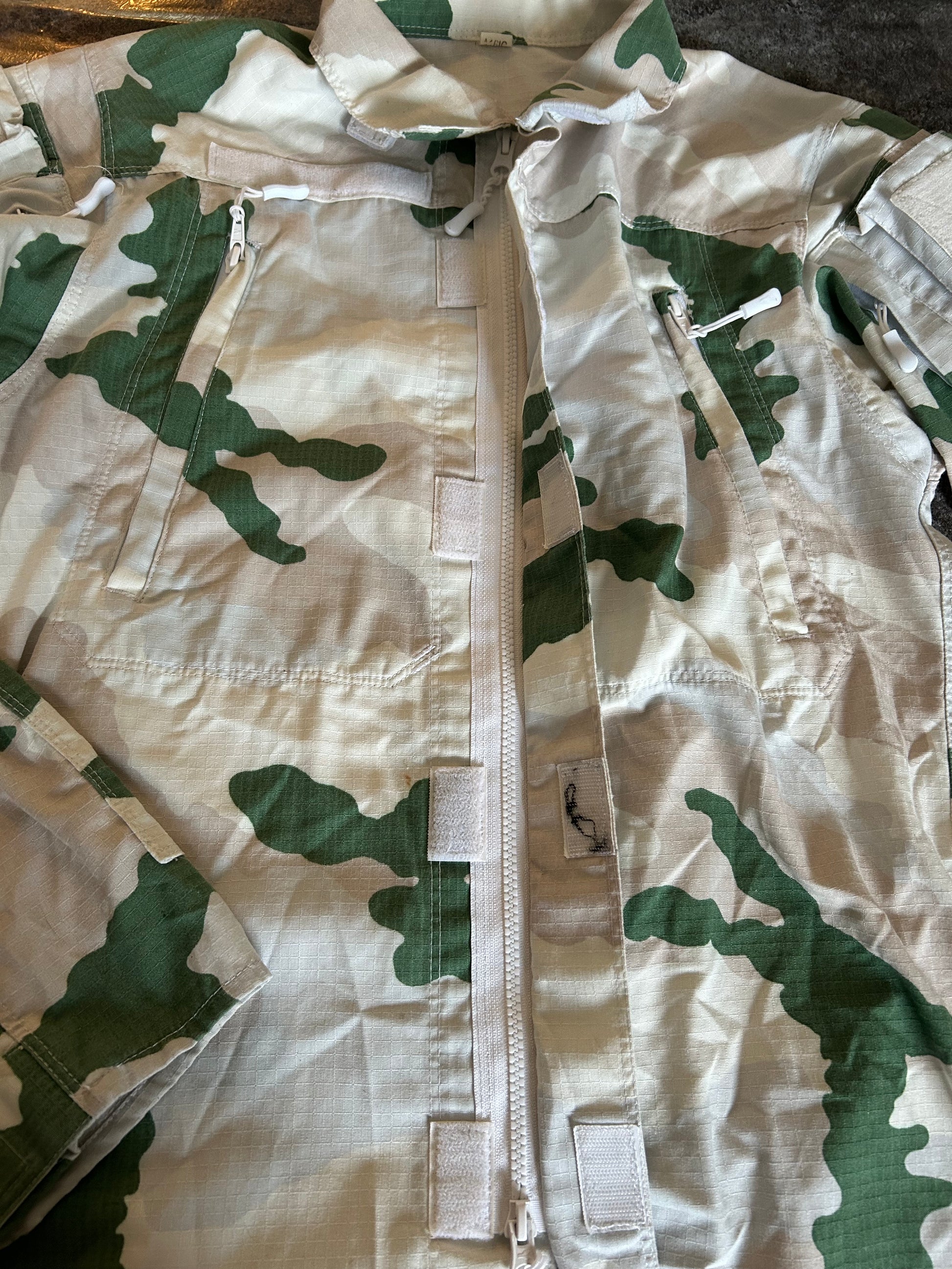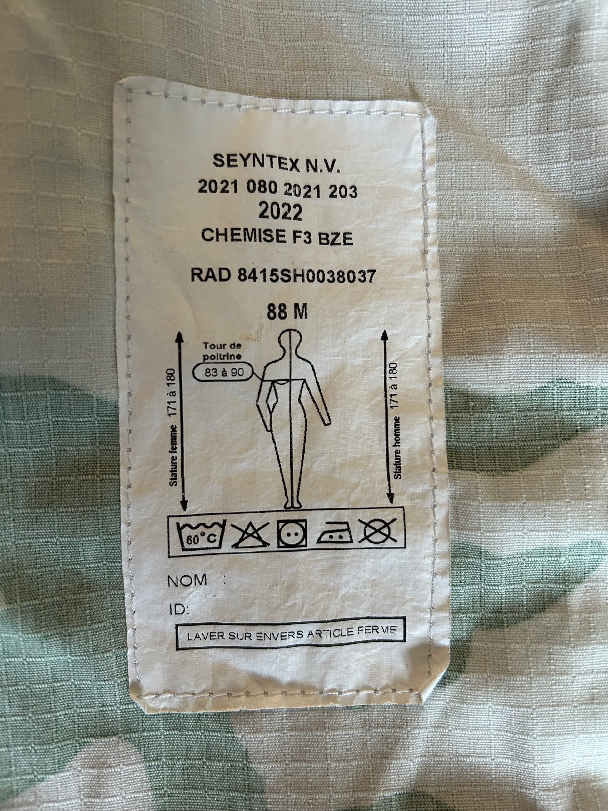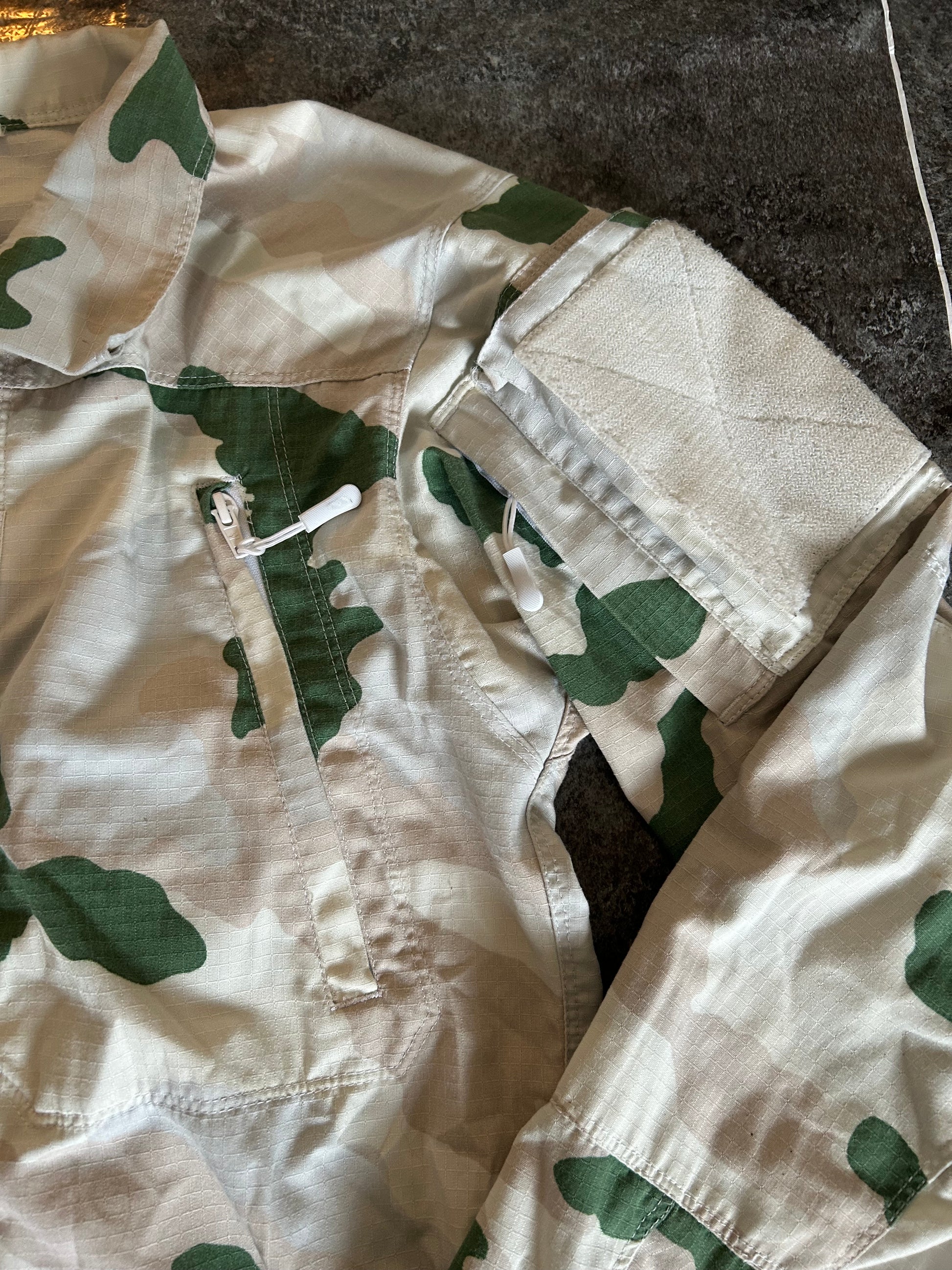 Often confused with a similar pattern made by Arktis, this shirt comes in the ZE pattern (= Zone Enneigée in French), and is basically a snow version of the standard French CCE camo. Very cool, plenty of pockets and zippers. I also have matching pants in Medium for sale in another ad of the French category.