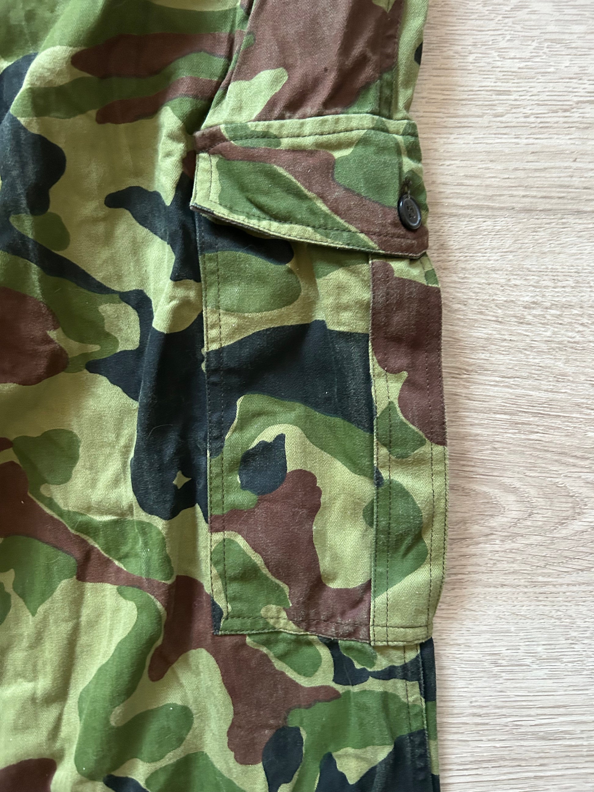 Now this is an interesting piece that you don't see much around! According to the label, these pants are the type 2 work uniform, Japan Ground Self Defence Force. This variant is very rarely seen, and way less known than the later flecktarn or pixelated type of Japanese patterns.
