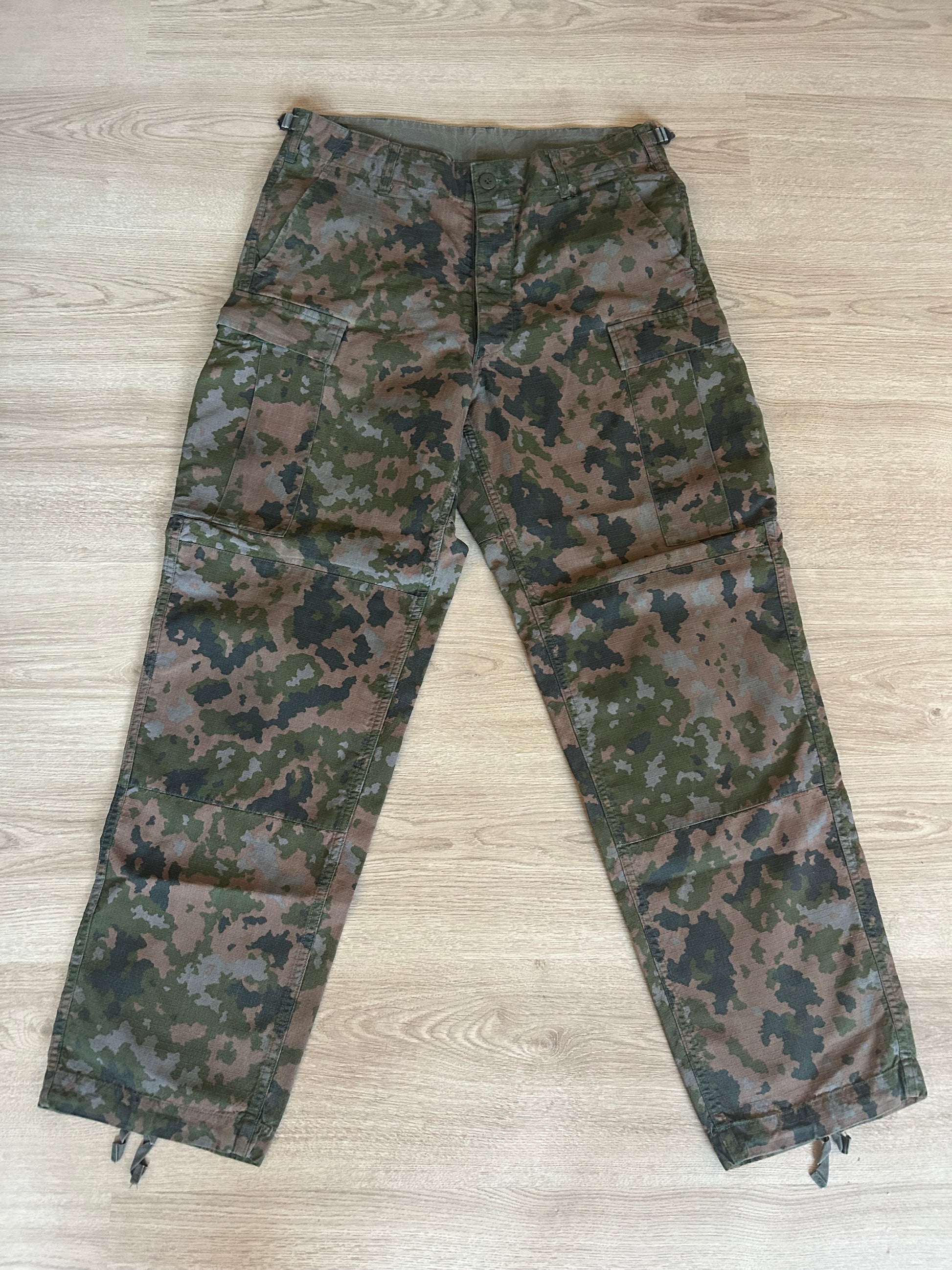 Genuine M2011 camo pants from Luxembourg. Standard issue, practical, and well-made. These pants come with two front pockets, two cargo pockets on the sides, and one in the back.