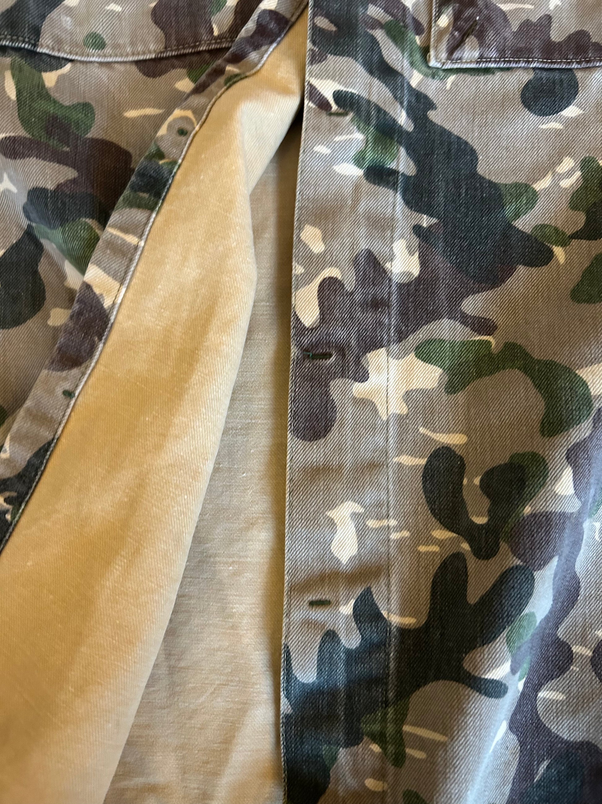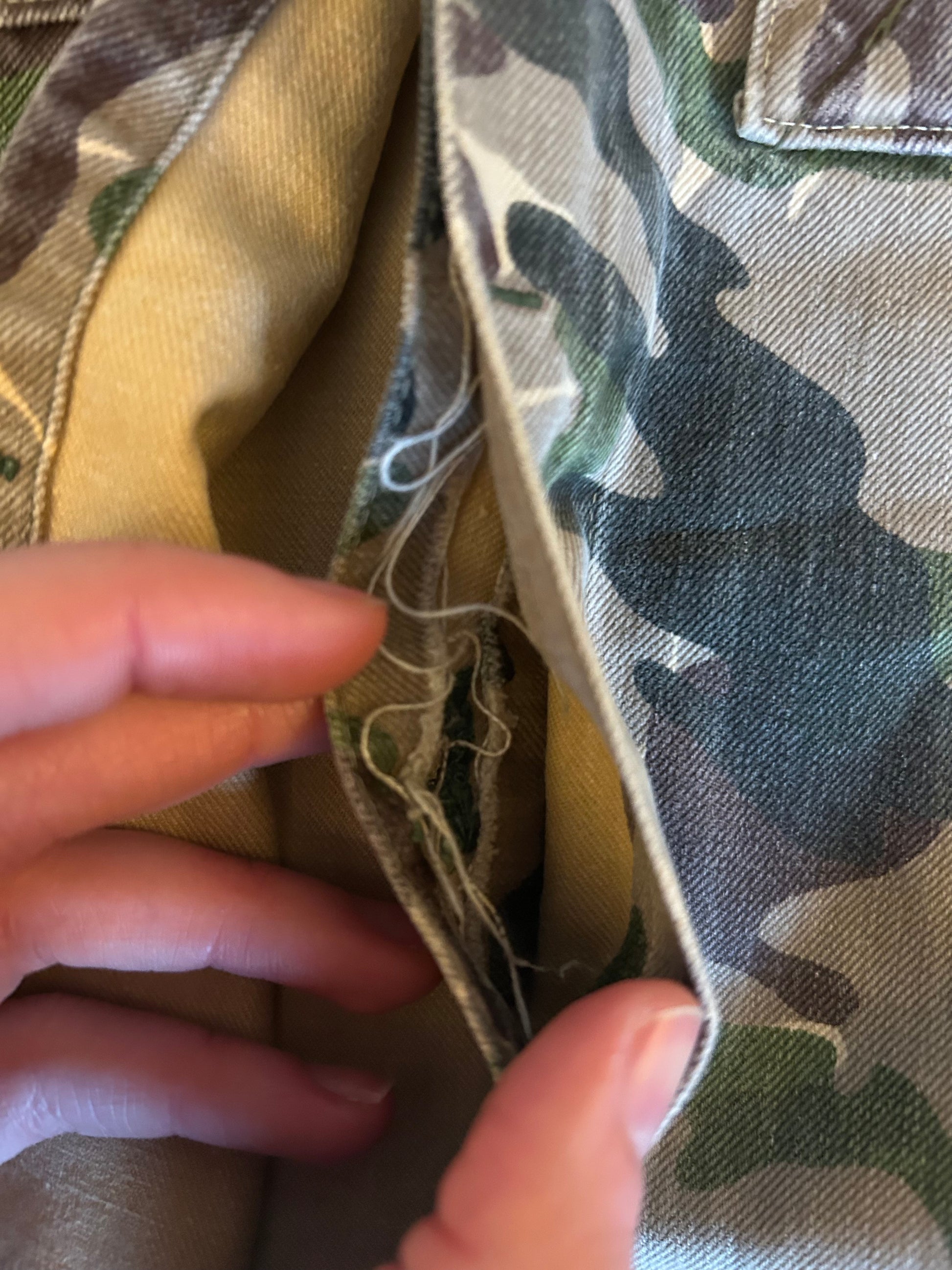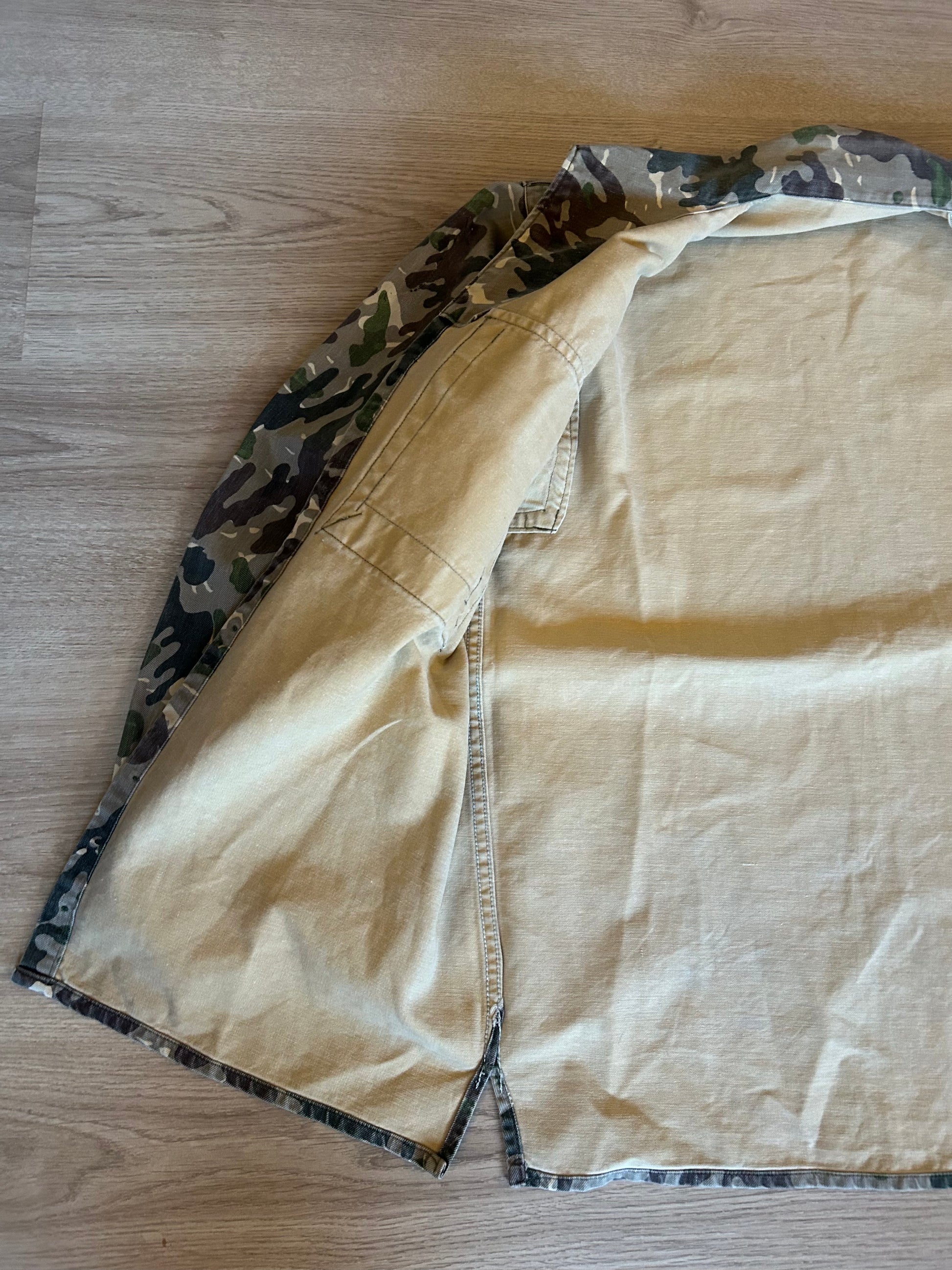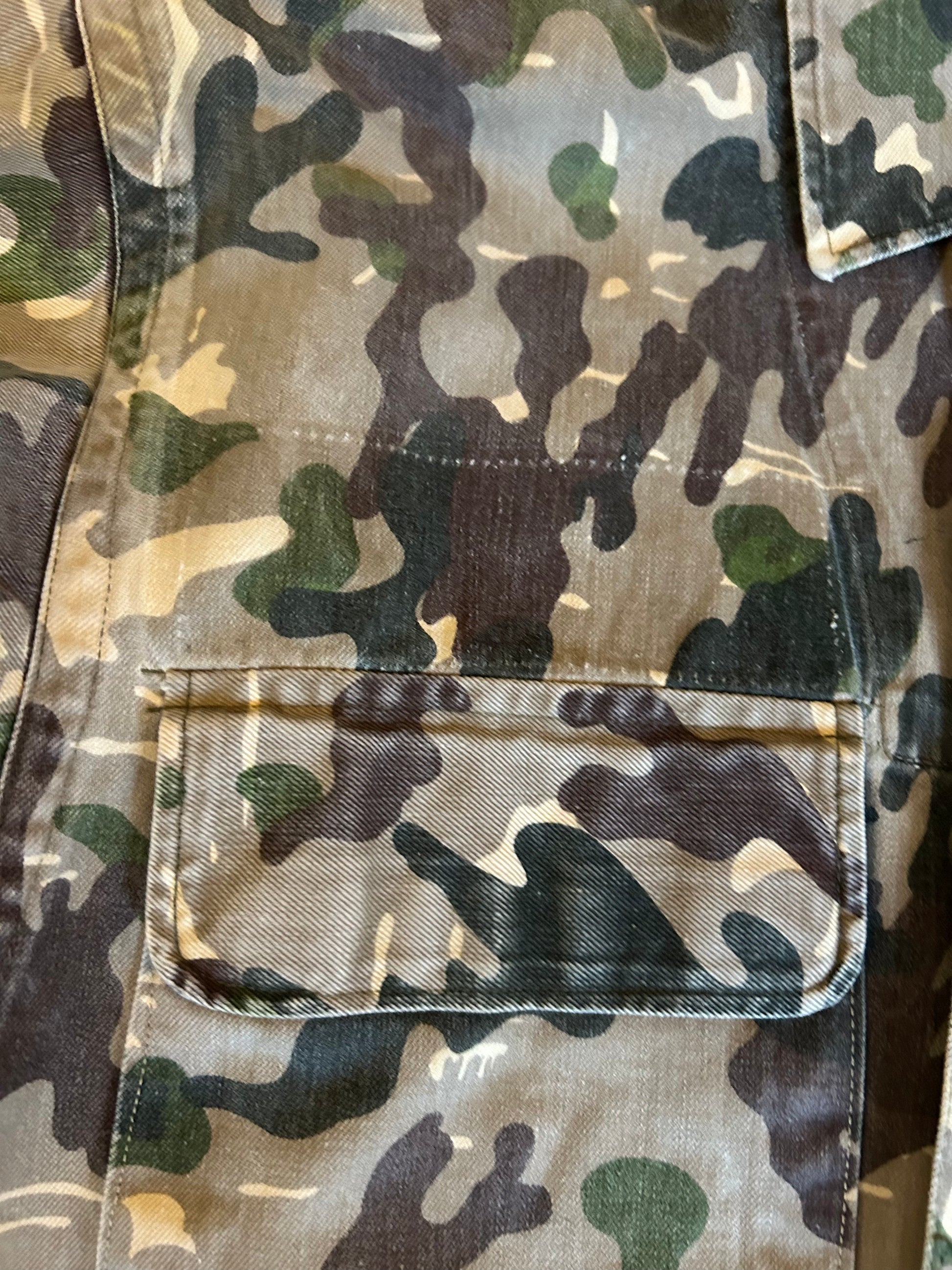 Condition: Issued, with some damage due to use by previous owners and storage throughout years. No big tears or holes visible on the outside material. However there are some tears in the middle layer between buttons as visible on photos, but this is NOT visible on outside when wearing the item. Apart from that, colors are somewhat faded. There are traces of previous patches on chest that have been removed, you can see slight color differences there.